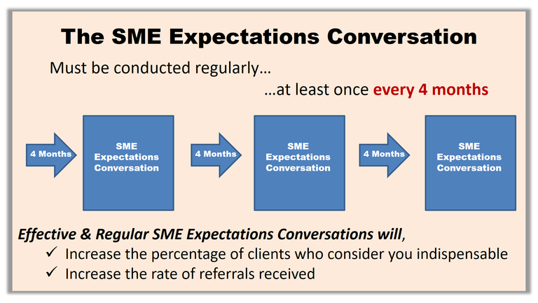 He concludes by showing how regular SME evaluations become “small levers that move big mountains,” driving higher indispensability ratings, spontaneous client referrals, and continuous firm growth."