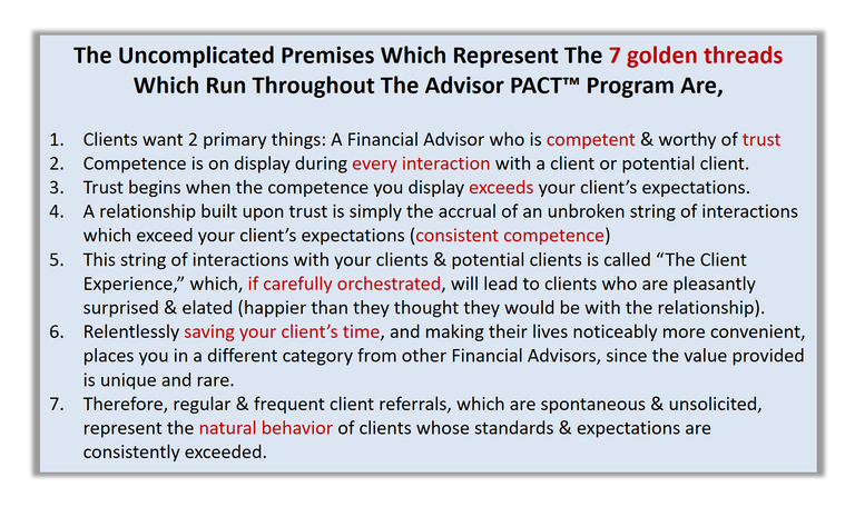 He concludes with the Seven Golden Threads™—the core beliefs of the Advisor PACT™ methodology—and Nine Transformational Fundamentals™ that help advisors design referable, efficient businesses built on trust, leadership, and Spontaneous Unsolicited Client Referrals™."