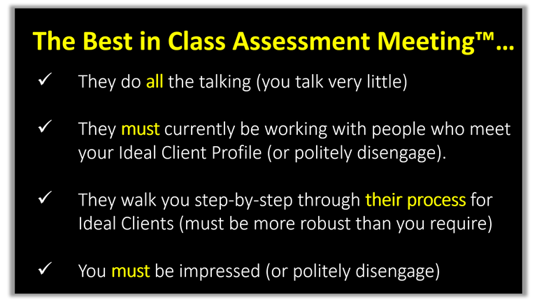 The second half focuses on The Deliverables Team Recruitment Process™, a 12-step system for sourcing, vetting, and selecting elite SMEs within 60 days. Mark emphasizes mastering The Best in Class Assessment Meeting™—a structured, advisor-led interview where candidates walk through their full client process to prove they can consistently exceed expectations.